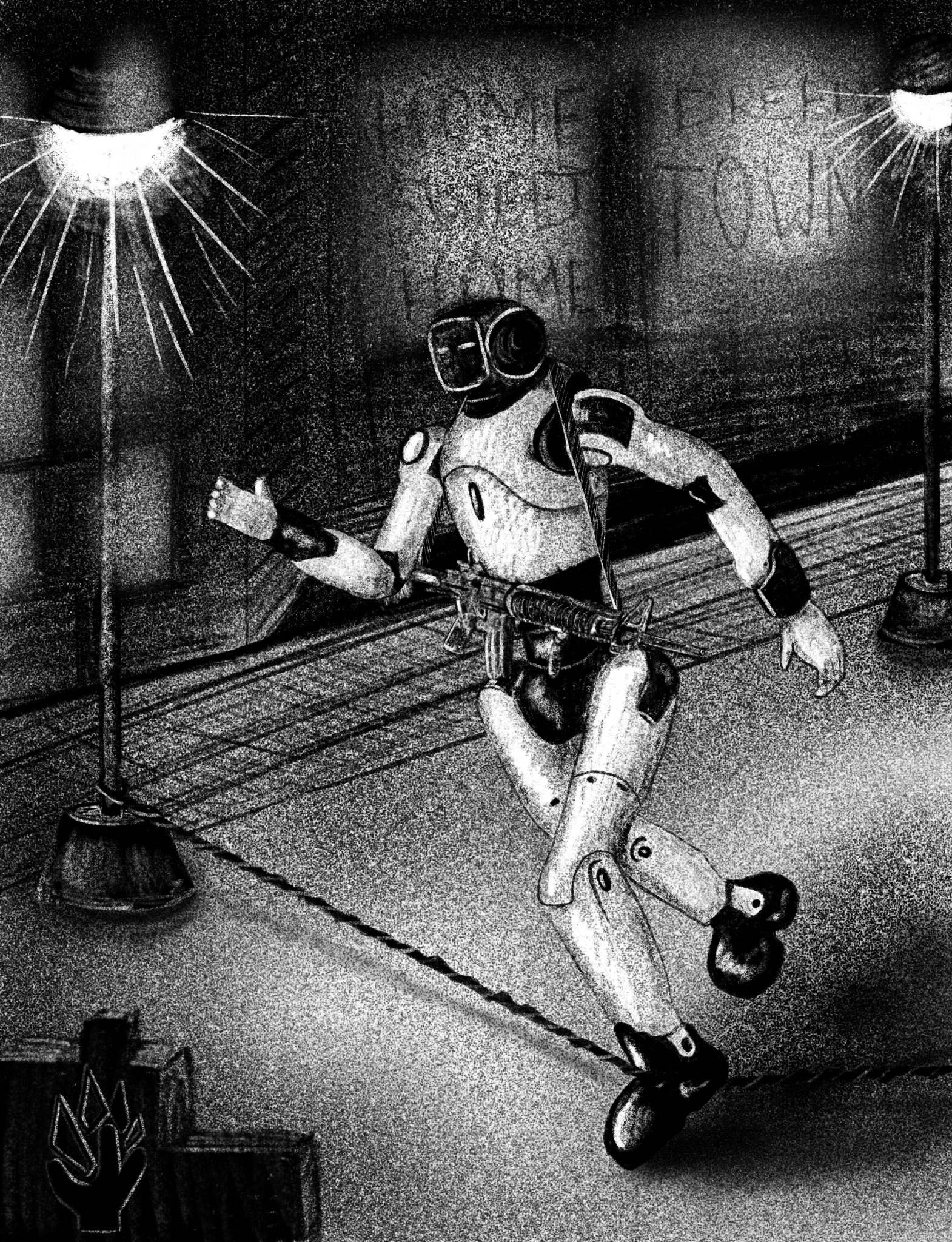 Роботы учатся ходить по пересеченной местности, но их системы балансировки не умеют реагировать на невидимые препятствия, которые сковывают движение.Идея: использование прочной рыболовной лески или кевларовой нити в качестве силка. Камеры робота физически не обладают достаточным разрешением, чтобы заметить темную нить толщиной в миллиметры на фоне земли.